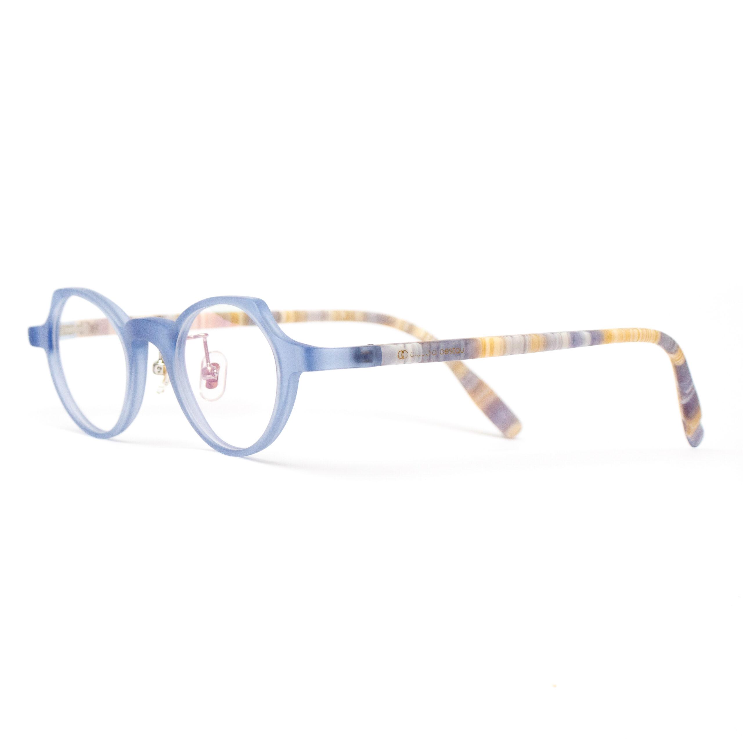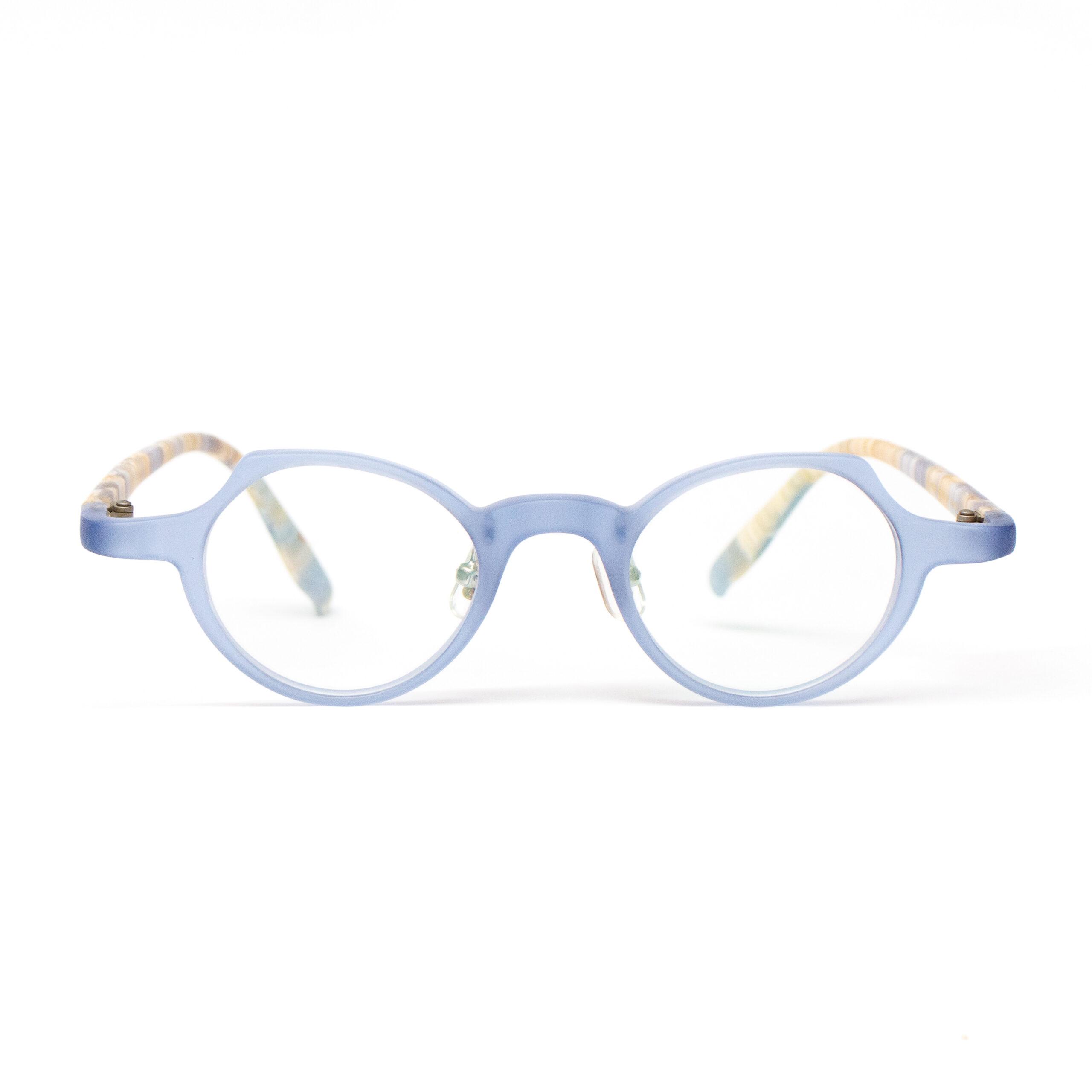 Lentes redondos (ovalados) de acetato color azul patas color moteado azul, amarillo y blanco.
