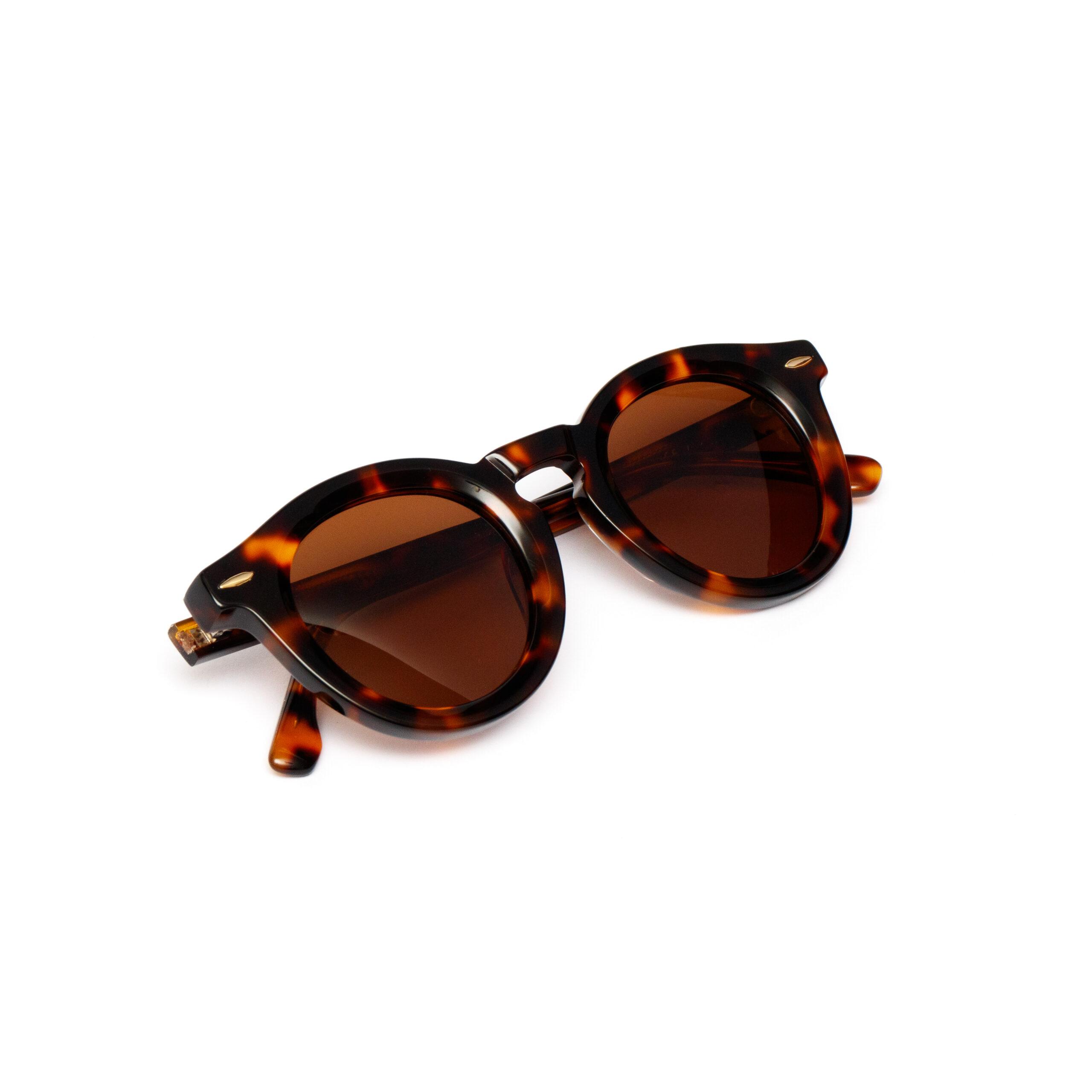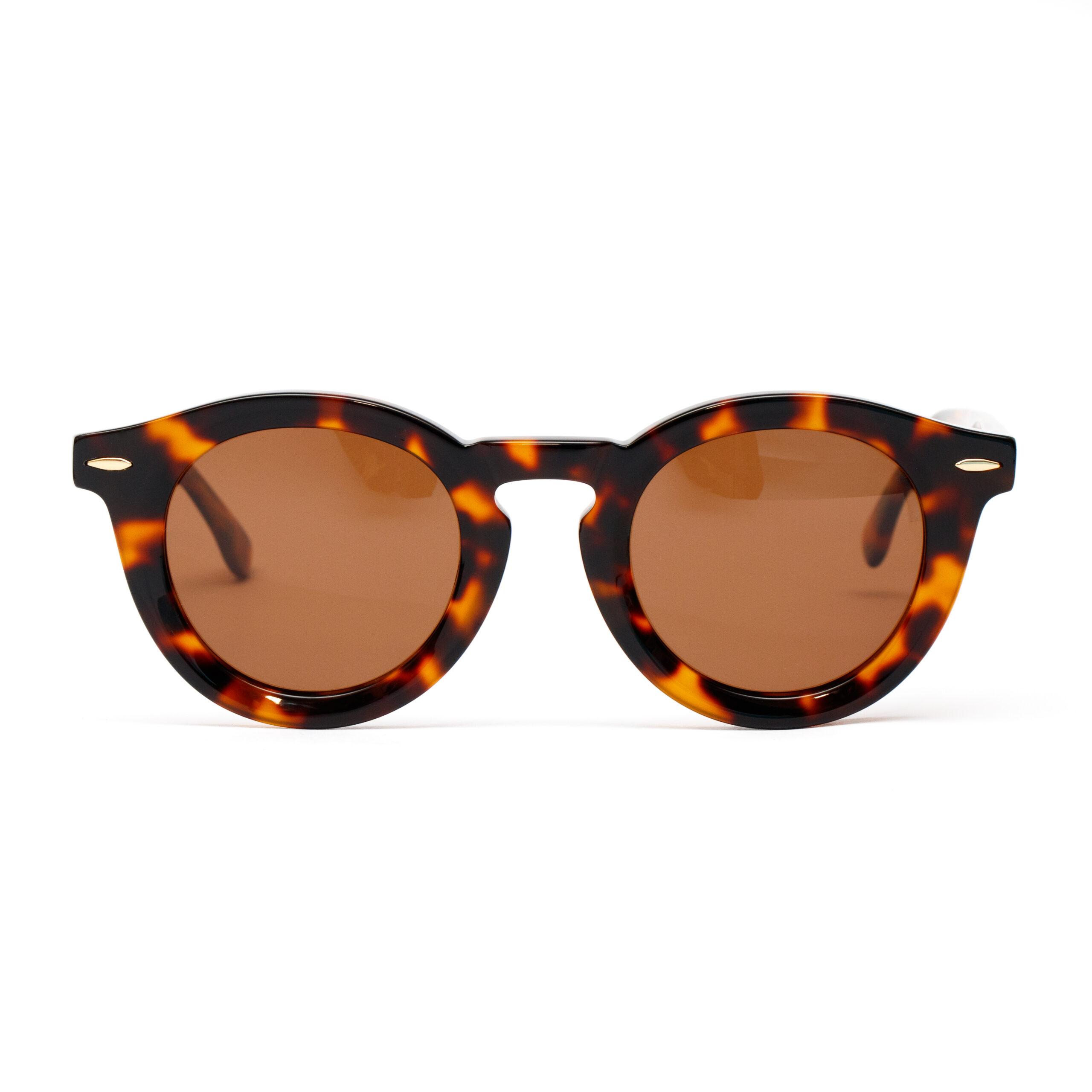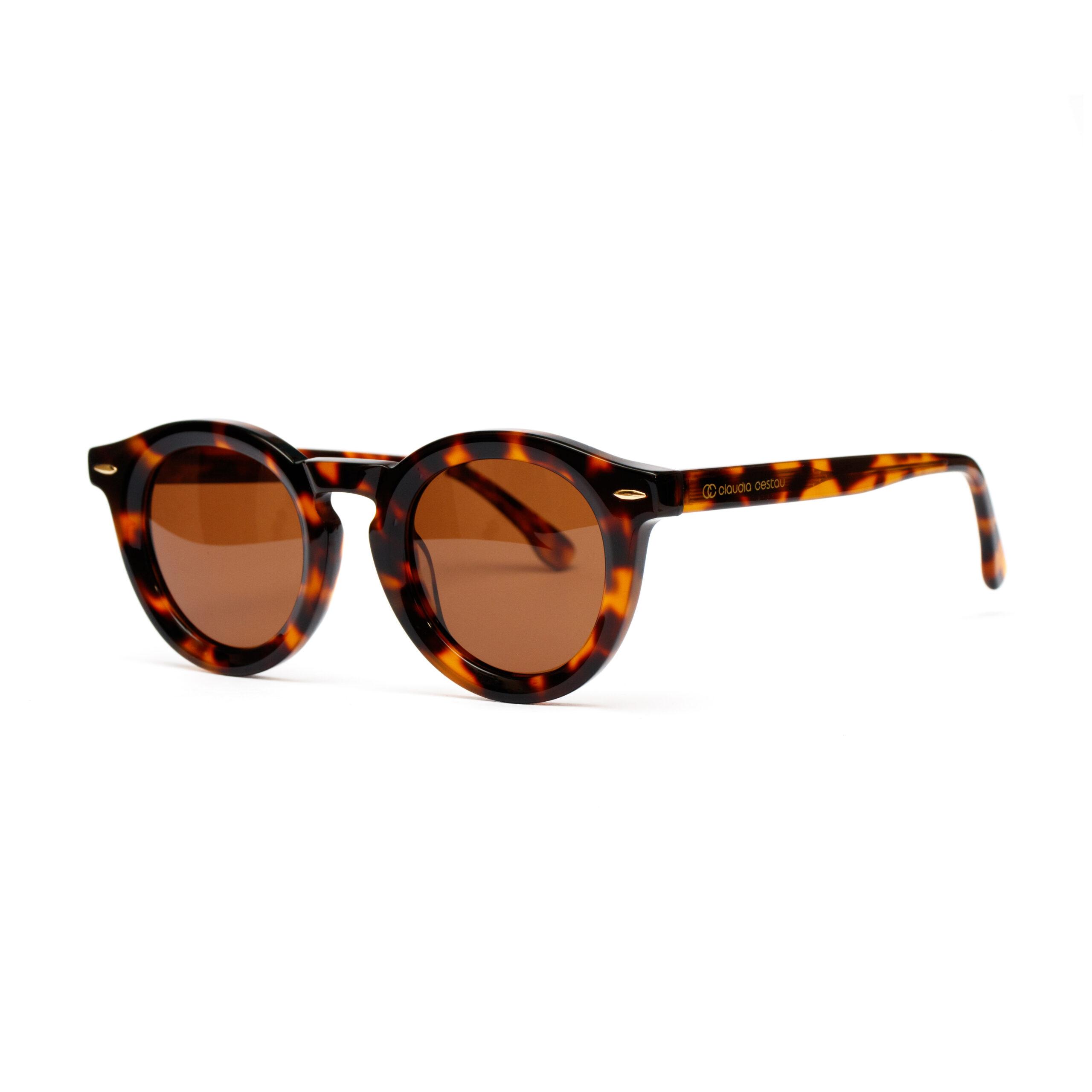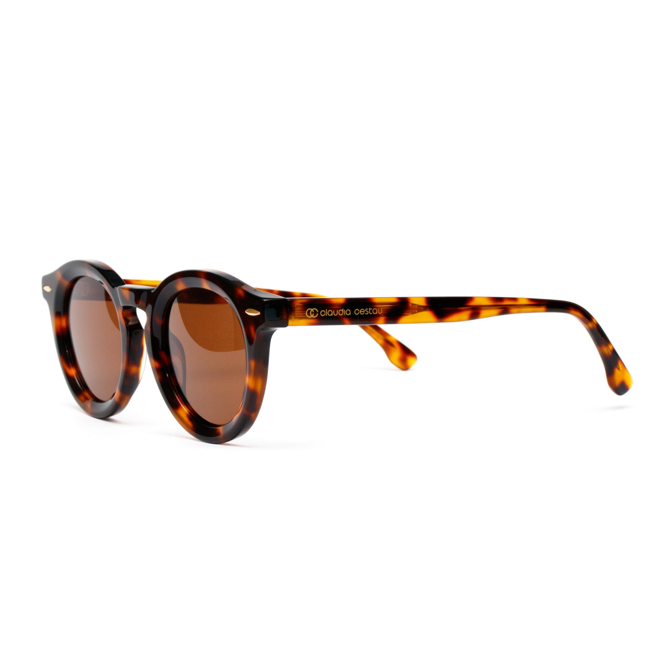 Lentes redondos de sol, de acetato, color tipo carey, micas color ambar polarizado.