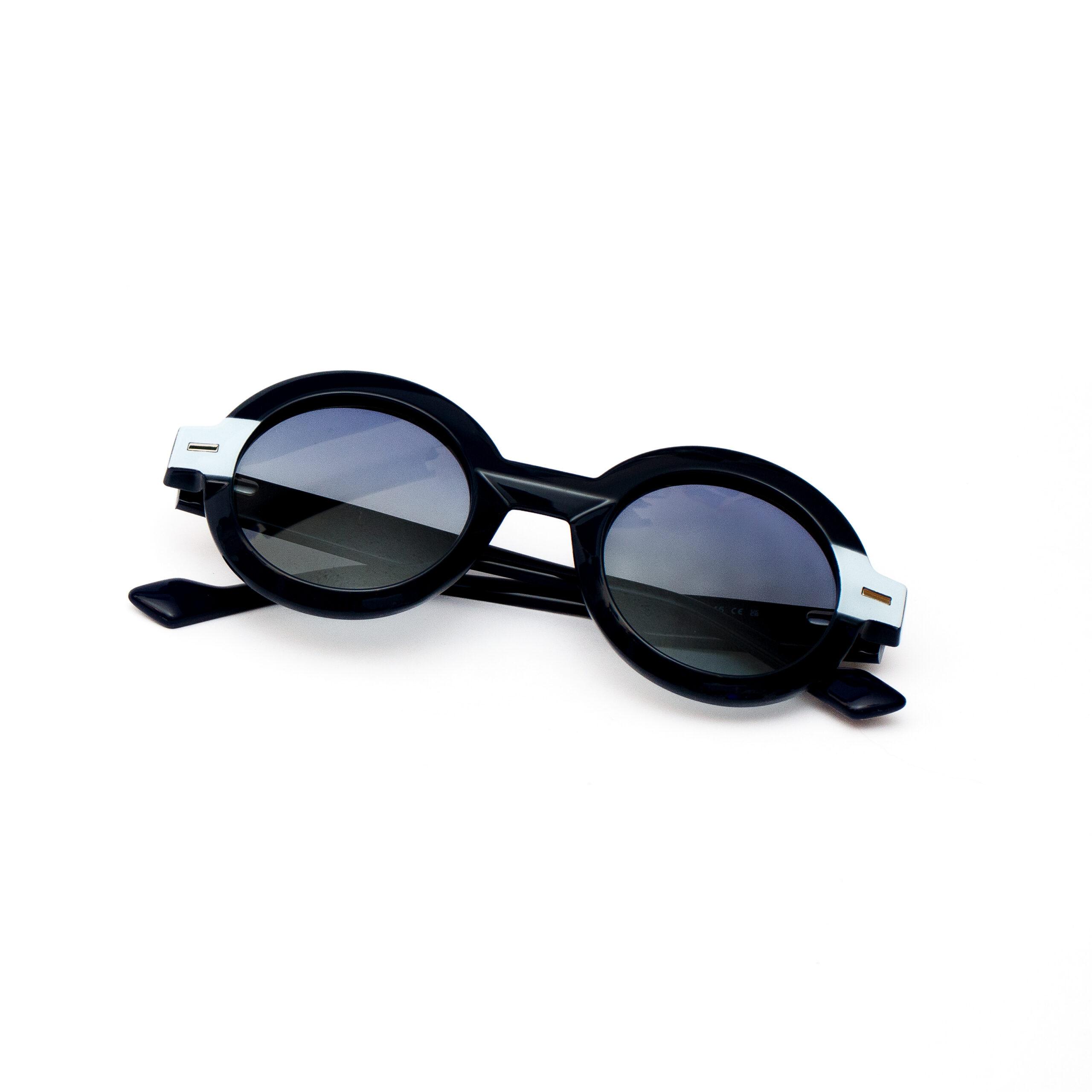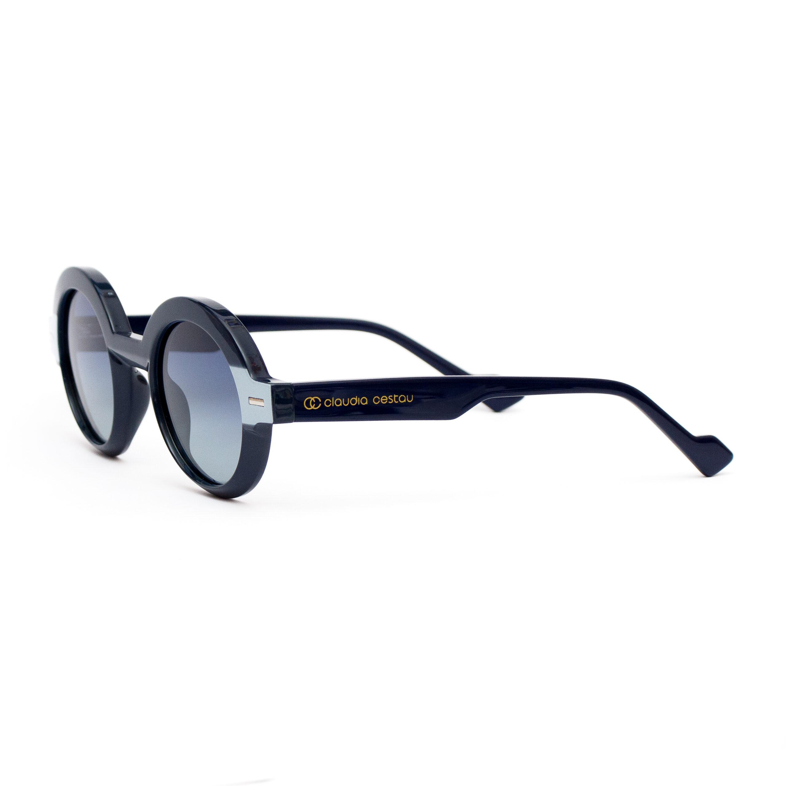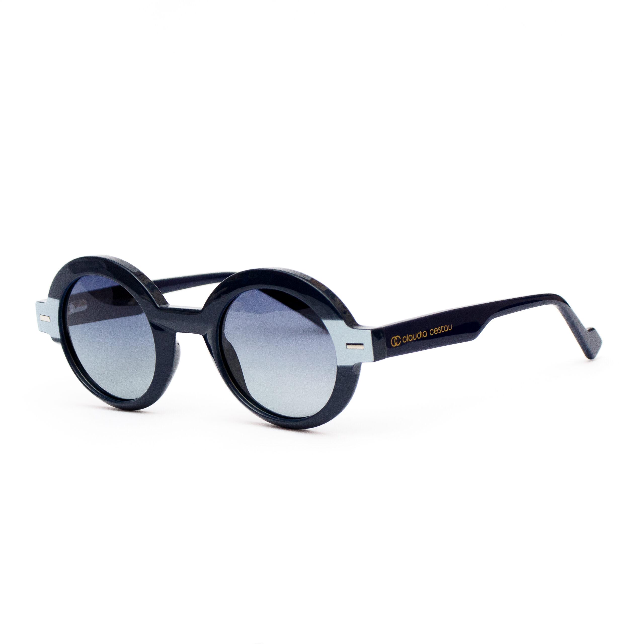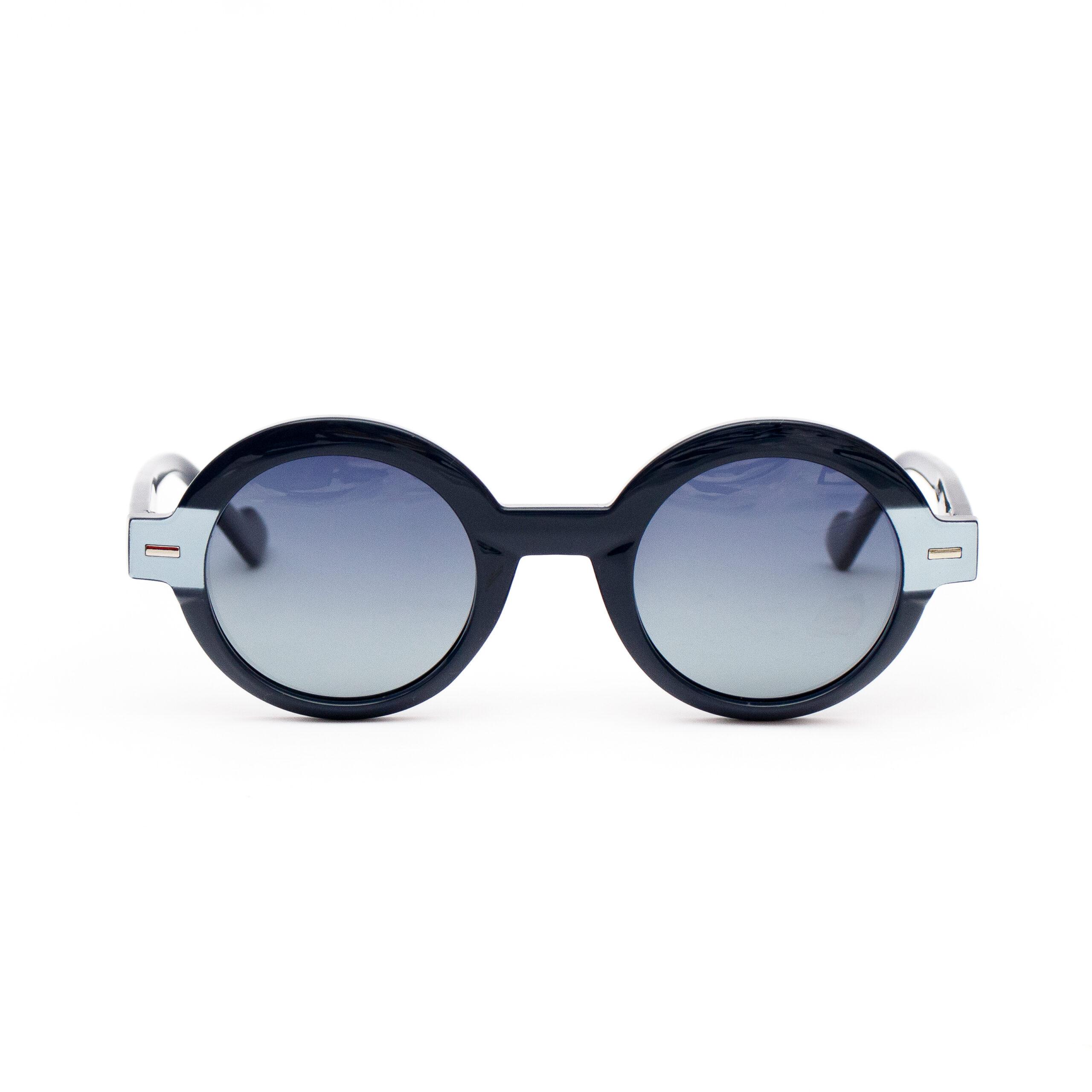 Lentes redondos de sol de acetato, color base azul, incrustación de metal en los costados del marco, azul degradado polarizado.