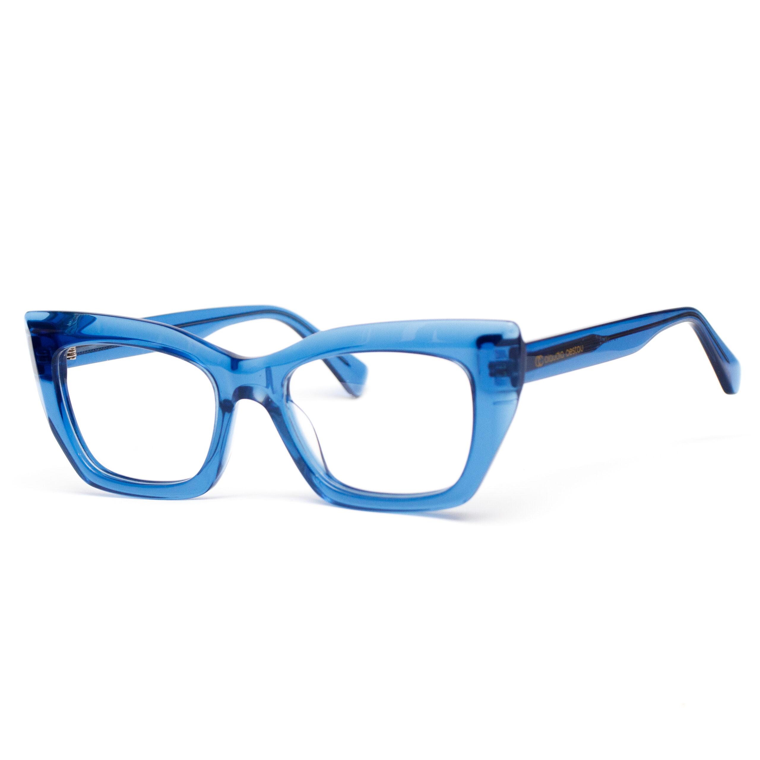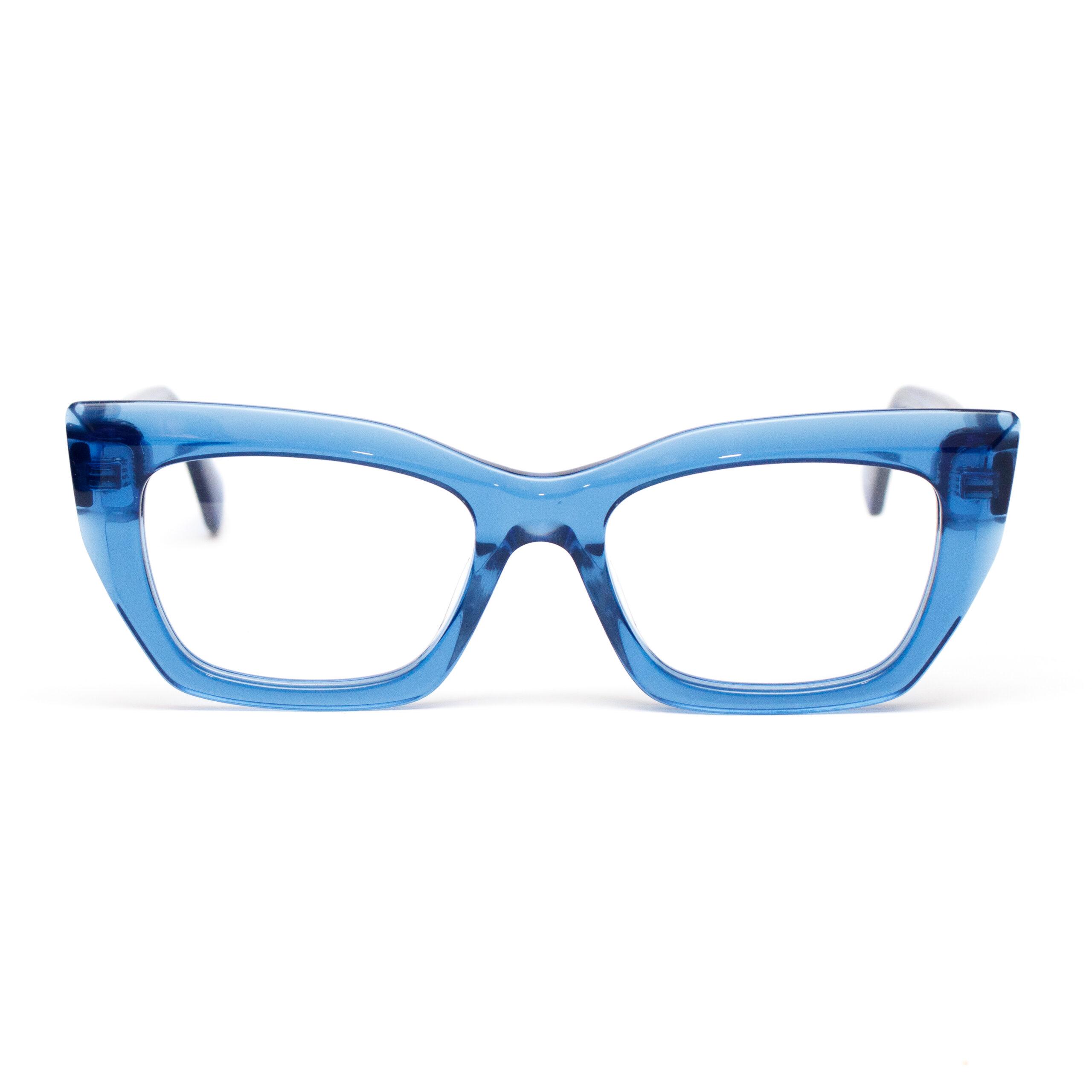 Lentes cuadrados (rectangulares) parte superior del marco en punta de acetato, color azul traslúcido.