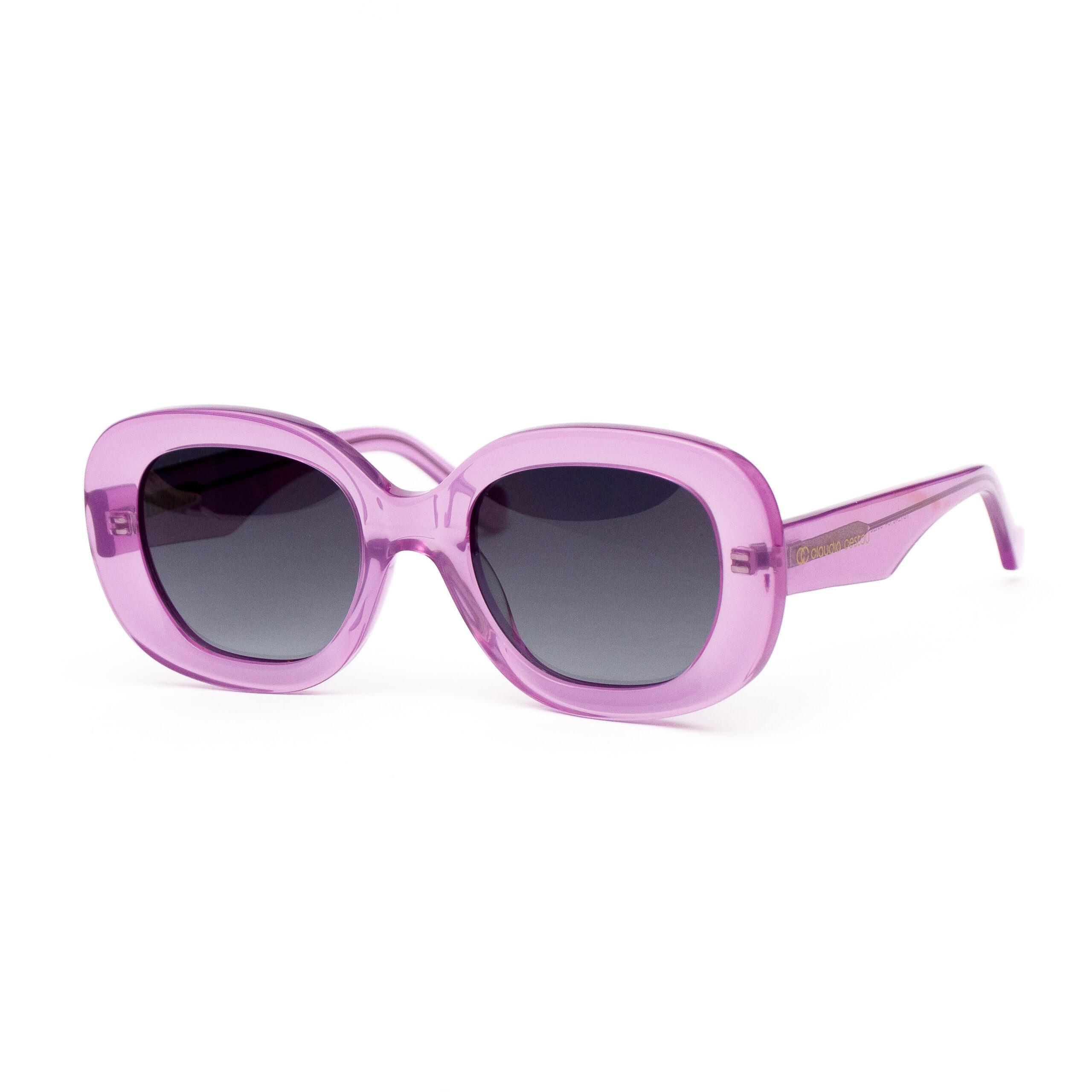 Lentes ovalados de sol de acetato, color violeta traslúcido, gris degradado polarizado.