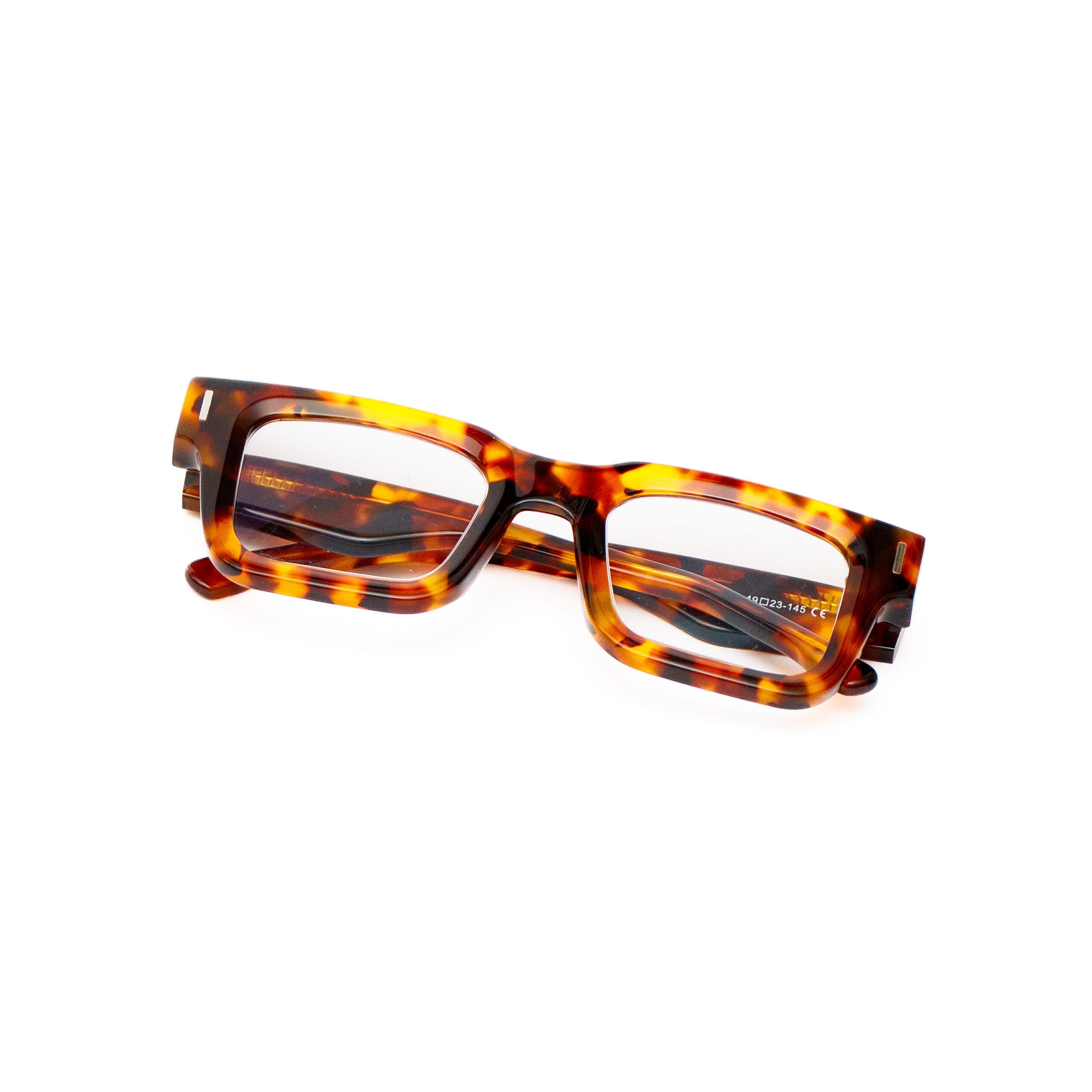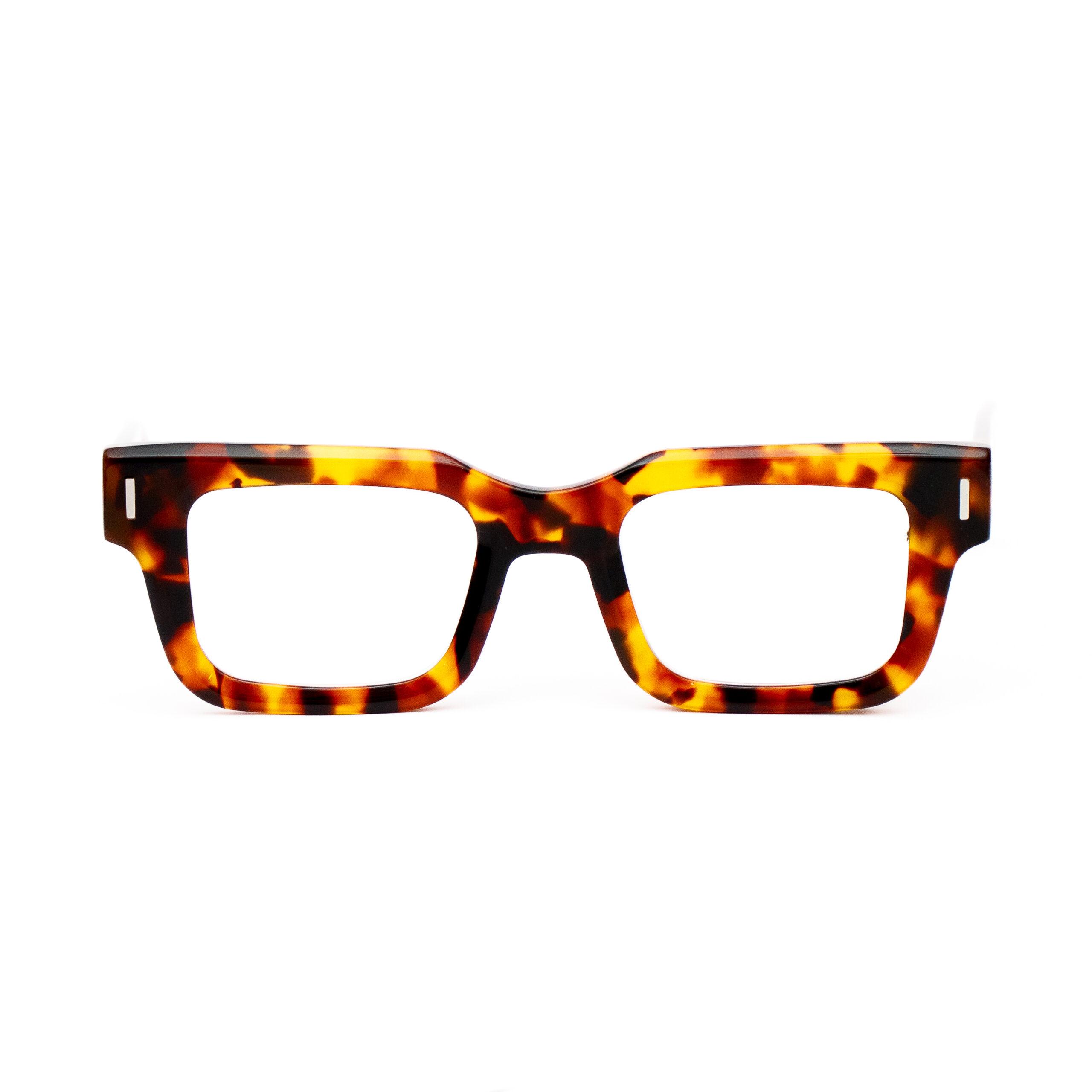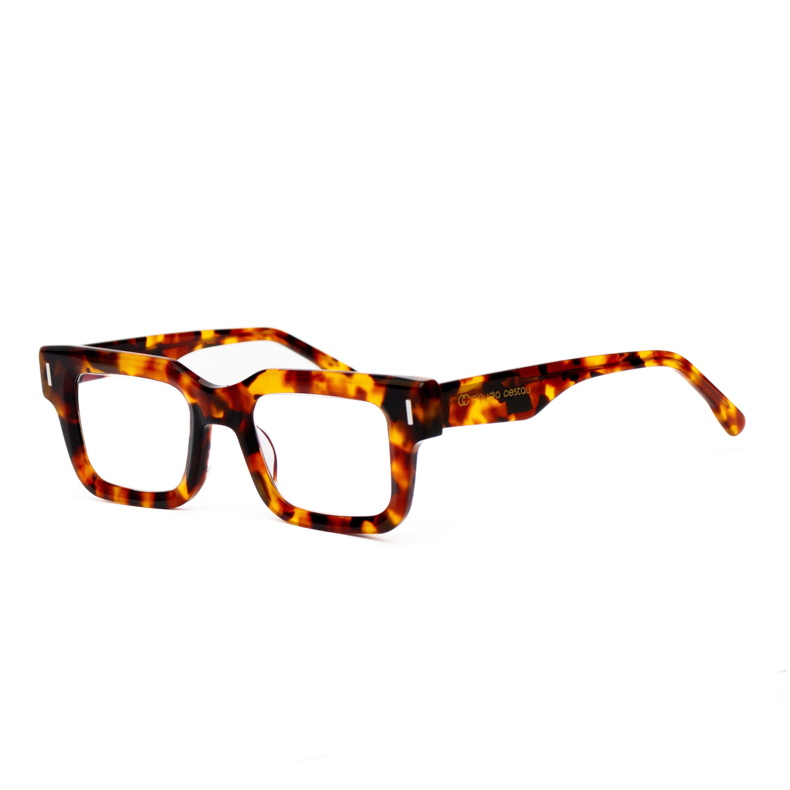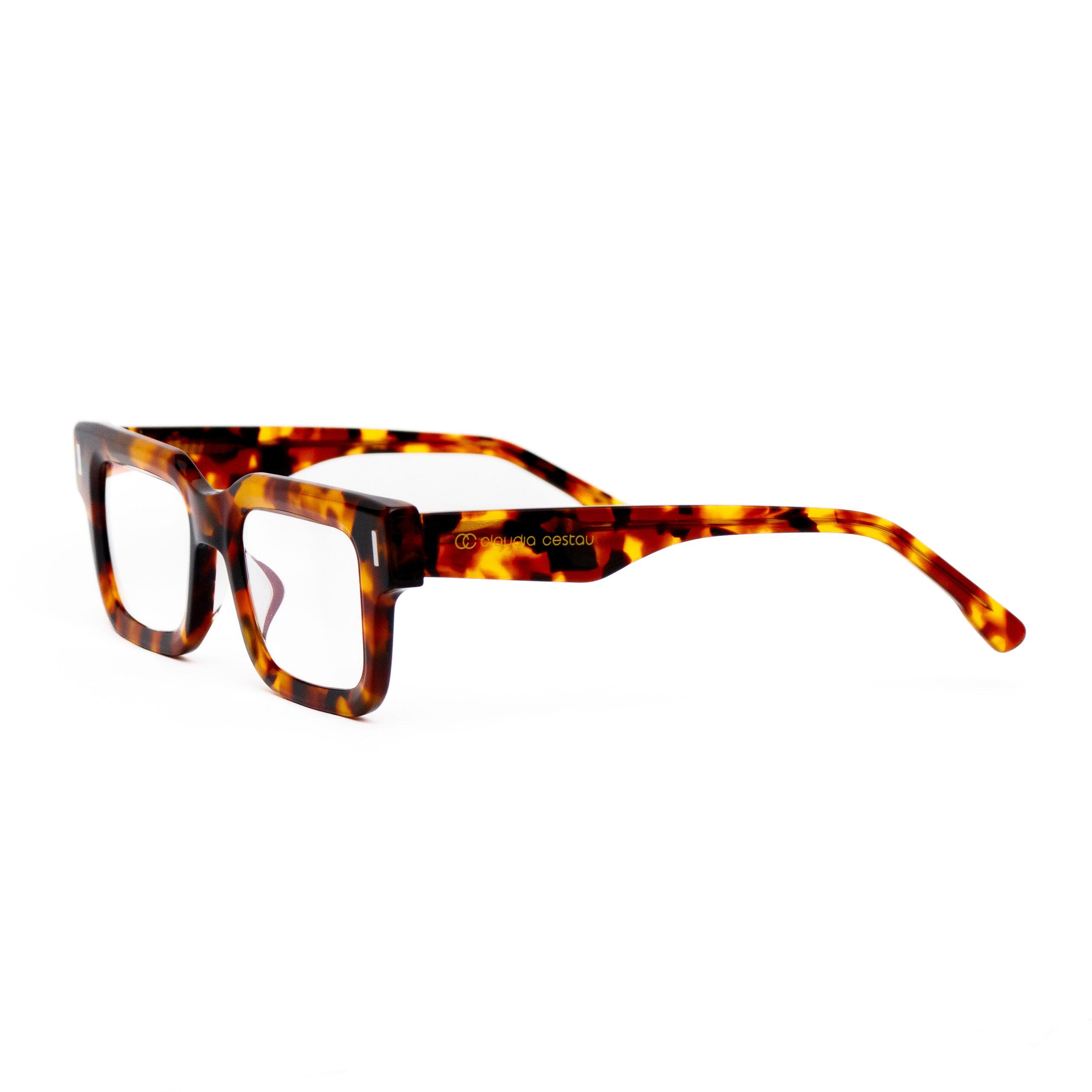 Lentes cuadrados (rectangulares) de acetato, color tipo carey, incrustación línea vertical a los costados del marco.