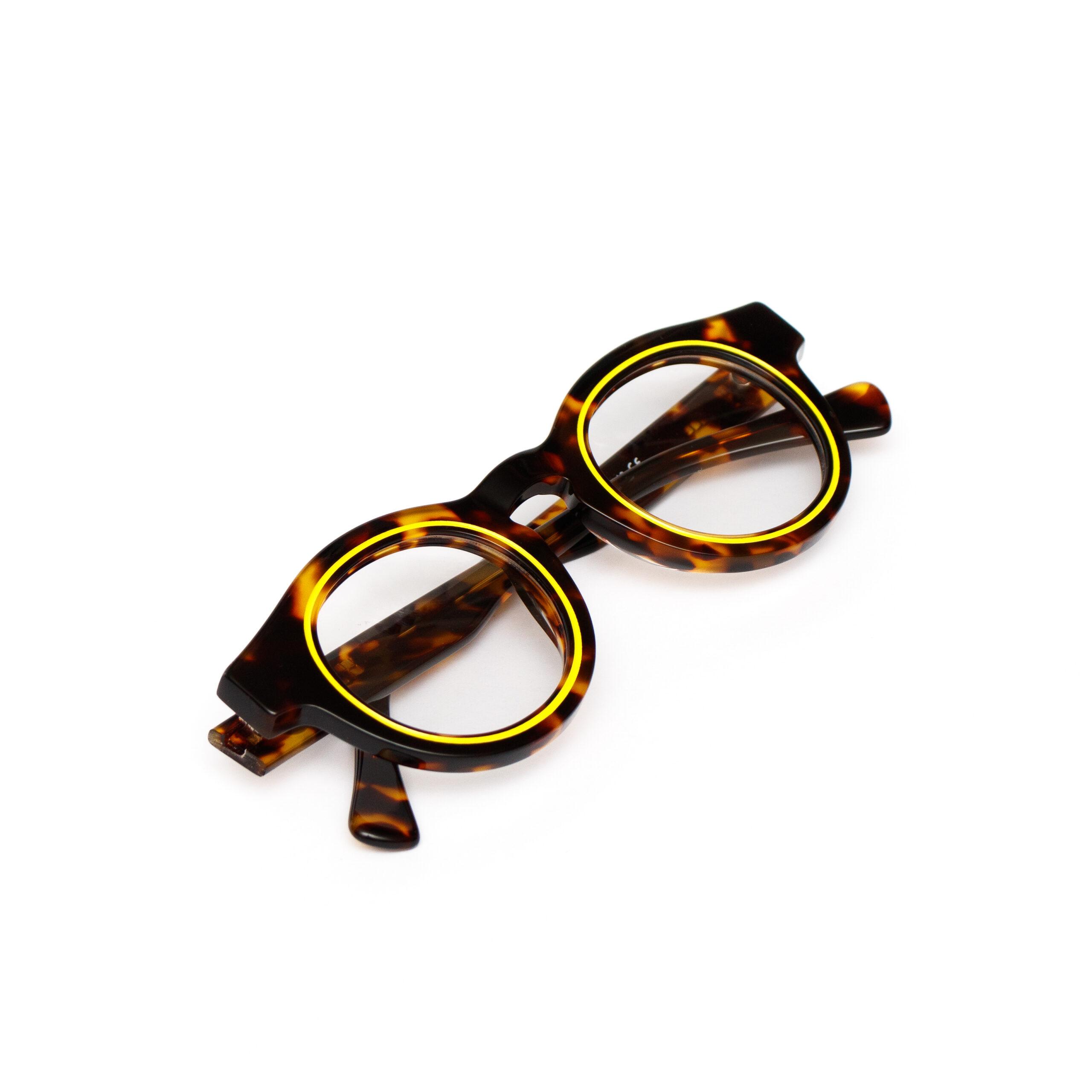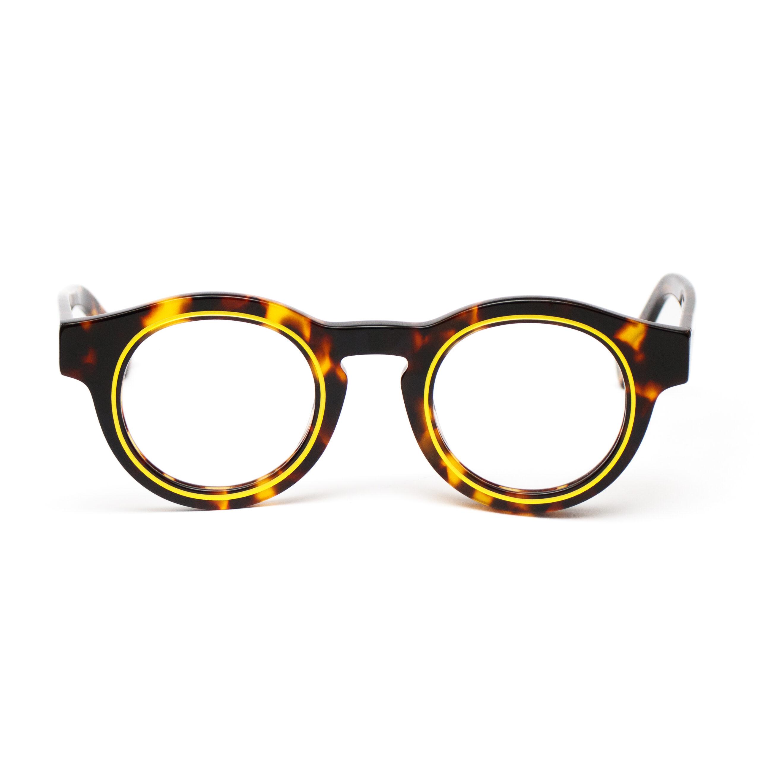 Lentes redondos de acetato, color tipo carey, línea circular amarilla al centro del marco, incrustación de círculo en base de la pata.